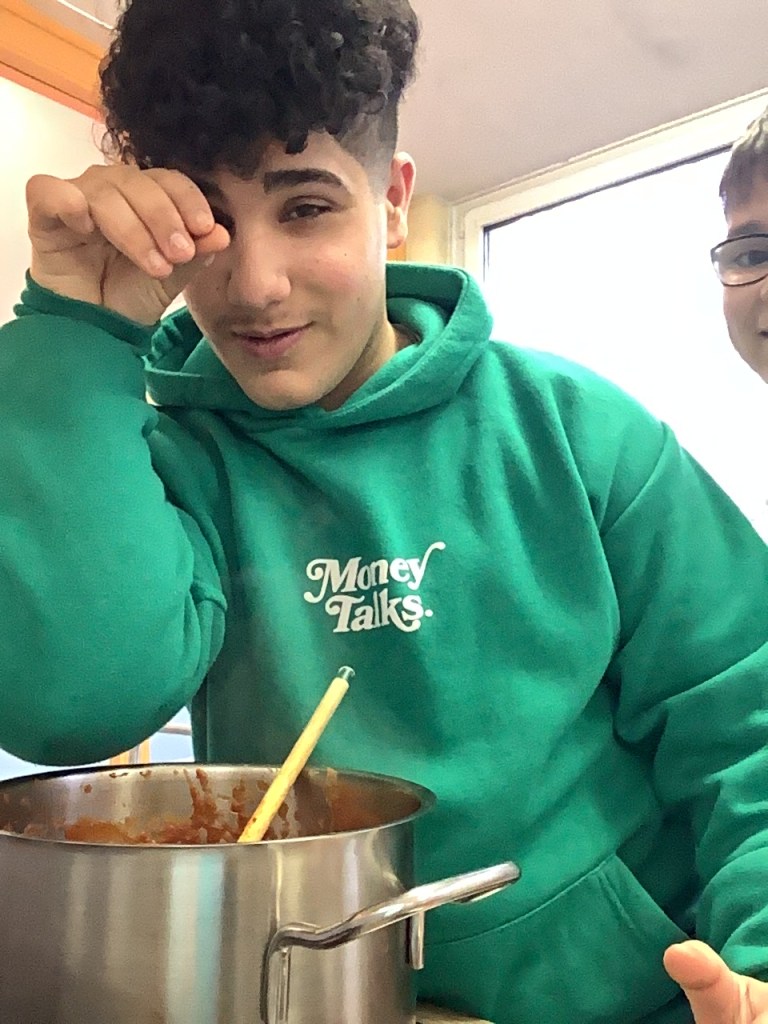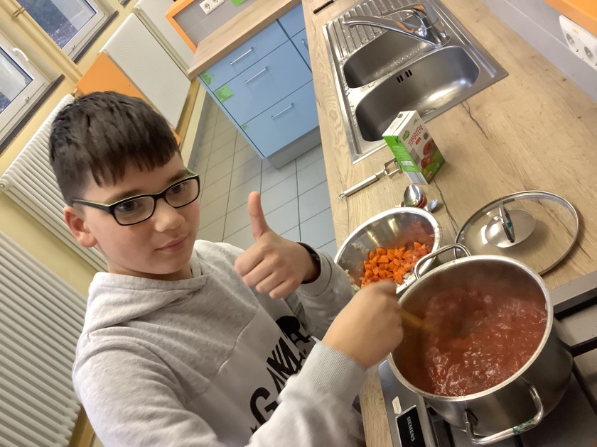 Dann fingen wir damit an, die Tomatensoße zu kochen. Zunächst mussten wir das Gemüse kleinschneiden und in Olivenöl andünsten. Dann haben wir die passierten Tomaten dazugegeben und mit Gewürzen uns Kräutern abgeschmeckt. Nun musste die Tomatensoße 30 Minuten köcheln.