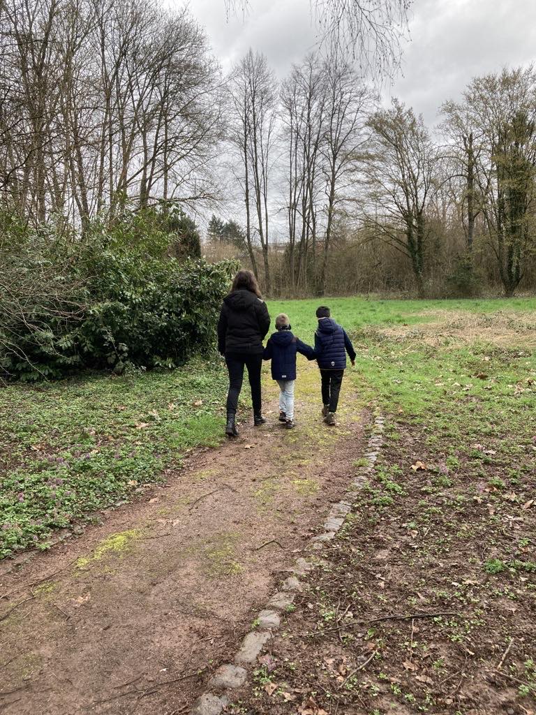 Nachdem wir blind die Umgebung „gesehen“ haben, spielen wir jetzt „Sachensucher“. Ein schönes Waldbild entsteht. Ein Kind findet viele kleine Nacktschnecken, eines eine Feder. Die vielen Stöcke können wir als Rahmen nutzen. So entsteht schnell mit vielen flinken Händen unser Bild. An unseren matschigen Schuhen sieht jeder wo wir unterwegs waren… 🙂