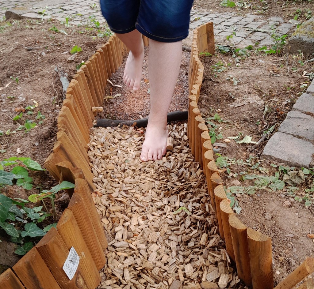 Die ersten nackten Füße erkunden unseren neu angelegten Barfuß-Pfad!