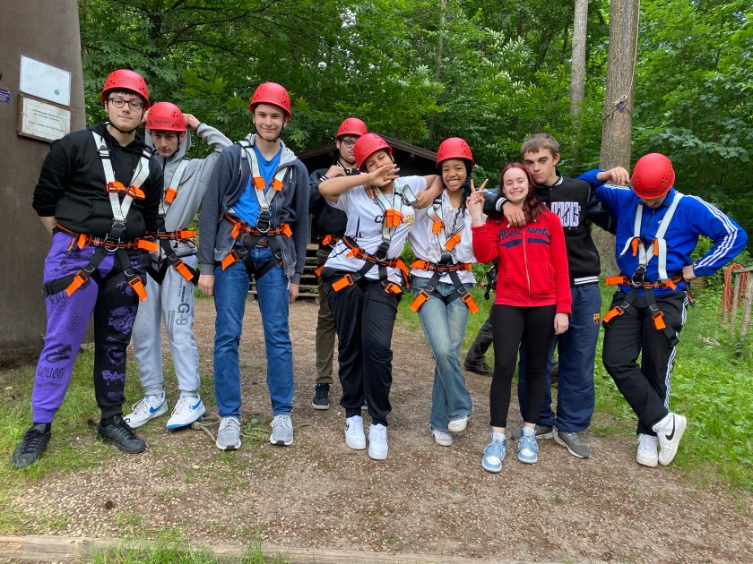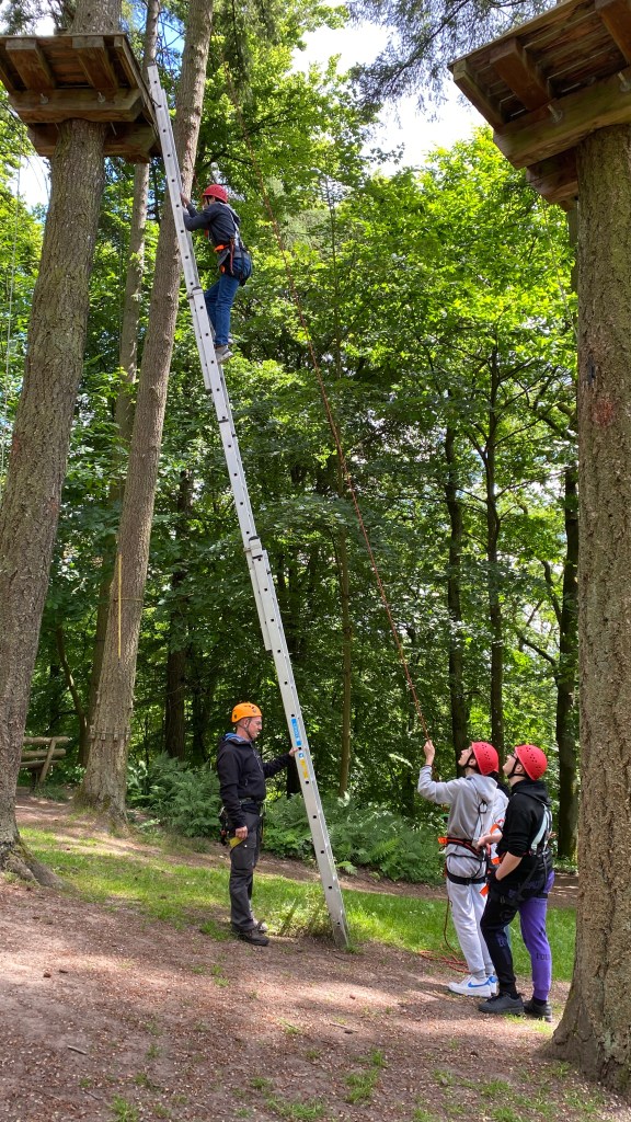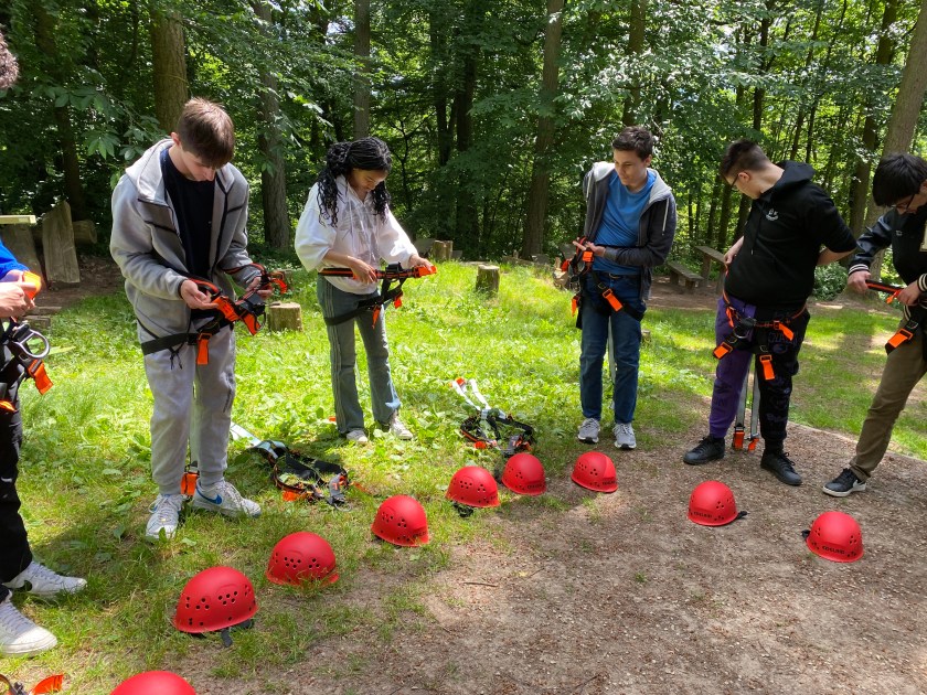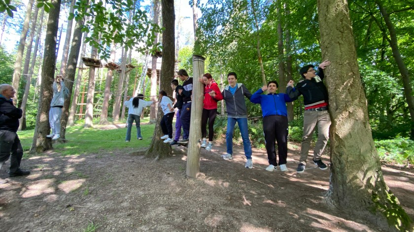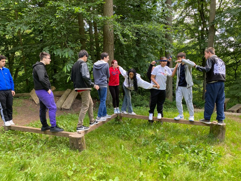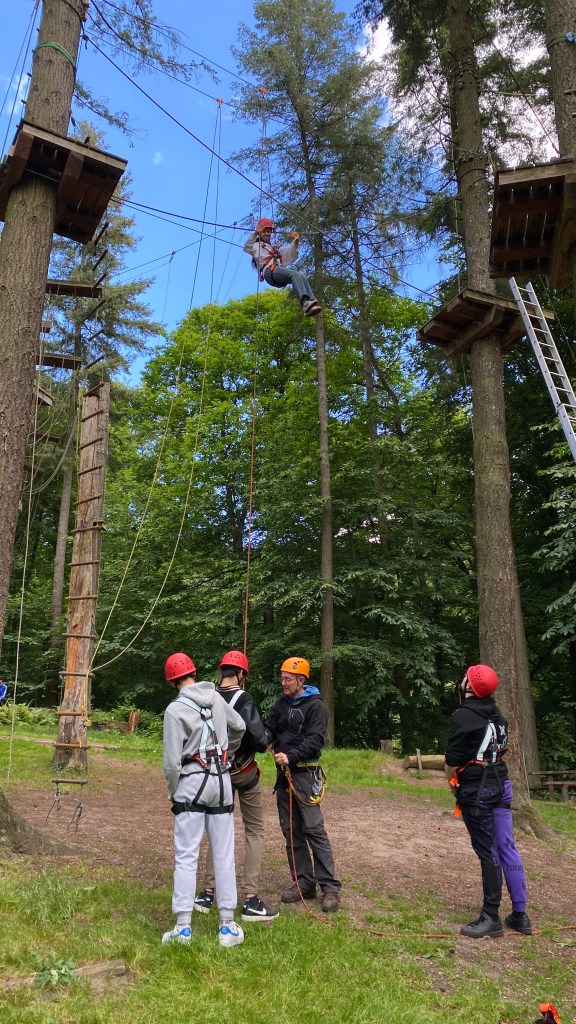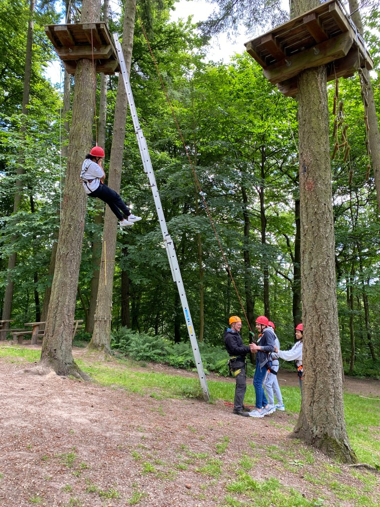 Wir, die Klasse 8-10, haben am 12.6. einen Ausflug zum Waldseilgarten im Weißhauswald gemacht, um dort Teamaufgaben zu meistern. Wir haben zuerst zwei Aufgaben am Boden bewältigt. Bei der ersten, dem Mohawk-Walk, mussten wir als Gruppe über einen Drahtseil-Parcours balancieren und uns dabei gegenseitig festhalten. Wenn jemand runterfiel, mussten alle neu anfangen.