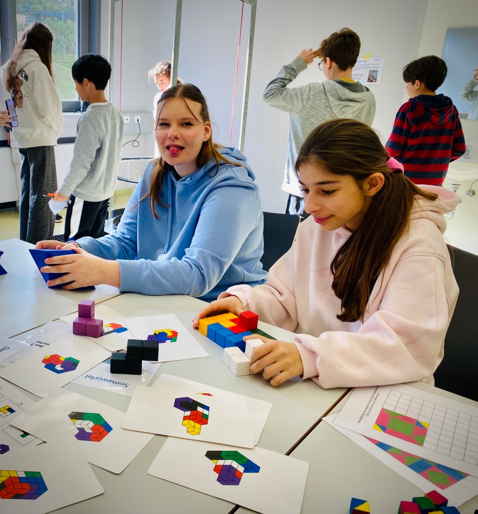 Am 10.3.26 waren wir mit der Klasse an der Universität Trier in der Ausstellung „Mathematik erfassen“. Nachdem wir mit dem Bus angekommen waren, durften wir mit der Klasse einer anderen Schule zusammen ins erste Experimentierzimmer. Dort gab es viele Matheaufgaben zum Ausprobieren. Zum Beispiel gab es verschiedene Holzteile, aus denen man Würfel oder andere Figuren zusammensetzen konnte und dabei ganz schön knobeln musste.