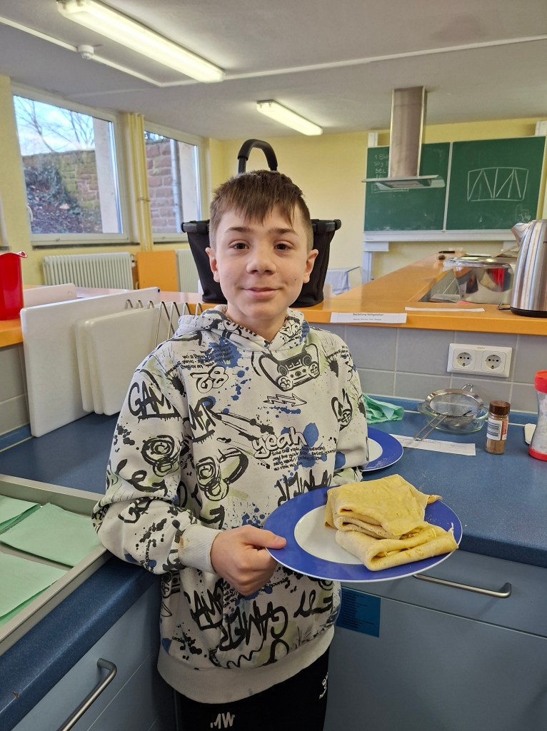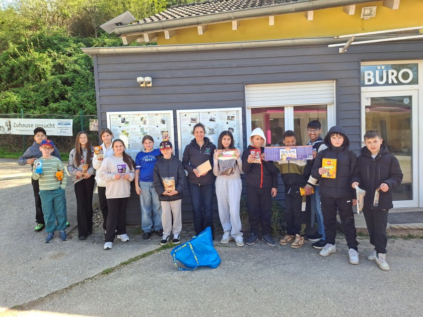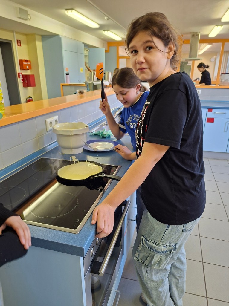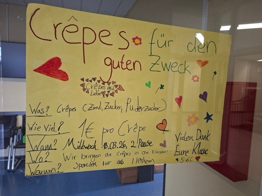 Lyon hatte die Idee, dass wir Futterspenden für das Tierheim sammeln. Das haben wir im Klassenrat besprochen und abgestimmt, dass wir Spenden für das Tierheim sammeln möchten. Viele Kinder haben auch Futterspenden mitgebracht. Dann sind wir darauf gekommen, dass wir „Crêpes für den guten Zweck“ in der Schule verkaufen wollen. Einen ganzen Tag haben wir in der Küche gestanden und Crêpes gebacken. Wir haben 100 € verdient.