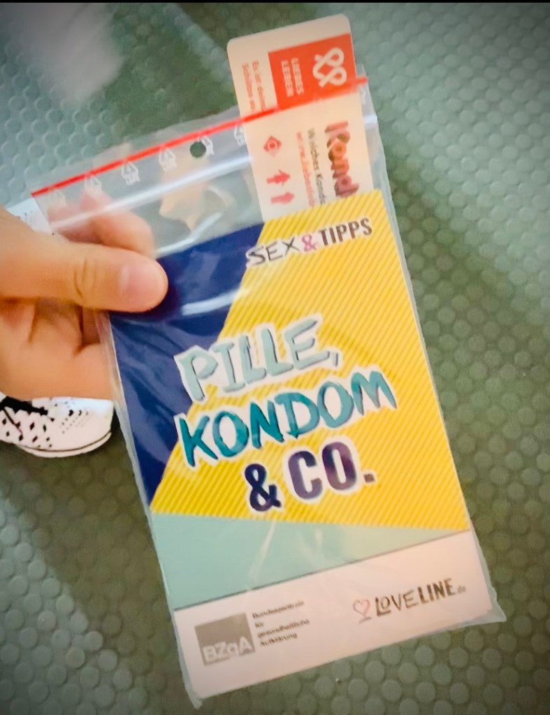 Als erstes besprachen wir, was wir schon über das Thema Verhütung und Geschlechtskrankheiten wissen. Danach gaben die Leute von der AIDS-Hilfe einen Sack herum mit Sachen, die alle etwas mit dem Thema zu tun hatten und jeder von uns holte eine Sache heraus. Danach besprachen wir im Kreis diese Dinge. Später erklärte uns der Mann von der AIDS-Hilfe, wie man ein Kondom richtig anzieht und wir konnten es an einem Holzpenis ausprobieren. Zum Schluss bekam jeder eine „Lümmeltüte“.