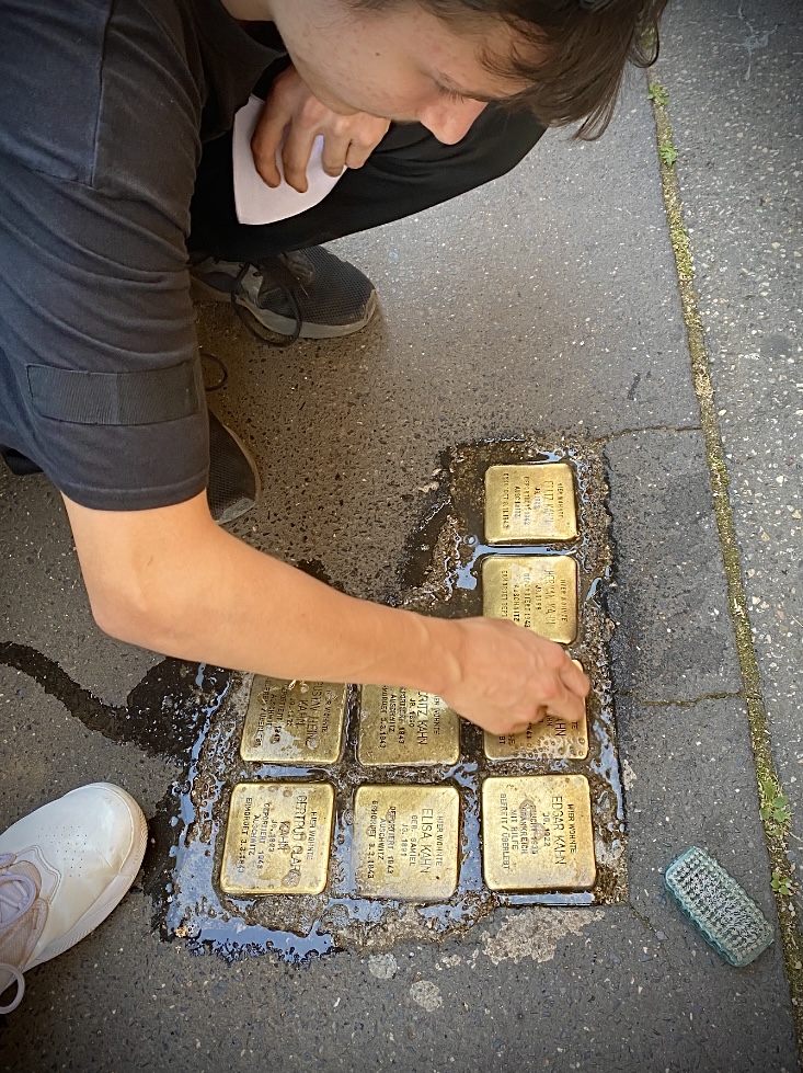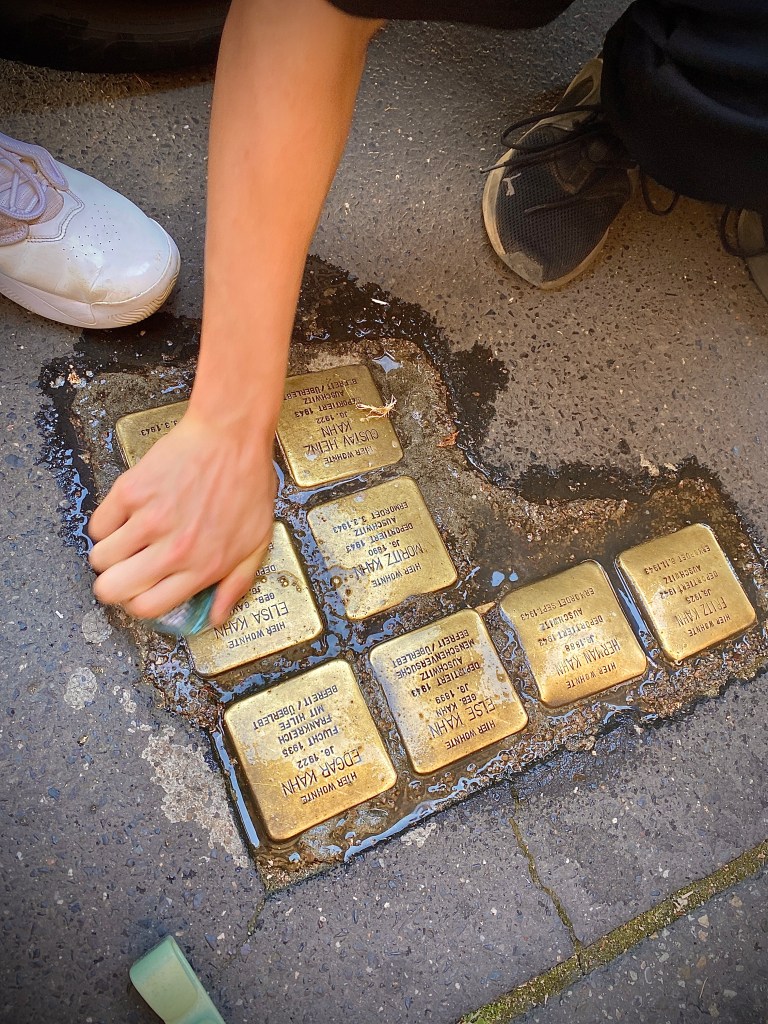 Vor den Ferien waren wir im Viertel unserer Schule unterwegs. Wir haben nach Stolpersteinen gesucht. Das sind kleine Steine, die im Boden auf den Gehwegen eingelassen sind. Sie erinnern an Menschen, die von den Nazis ermordert wurden. Man findet sie vor den Häusern, wo die Menschen zuletzt gewohnt haben. Wir haben die Stolpersteine gesäubert. Jetzt kann man die Namen der Menschen wieder gut lesen und sich an sie erinnern.