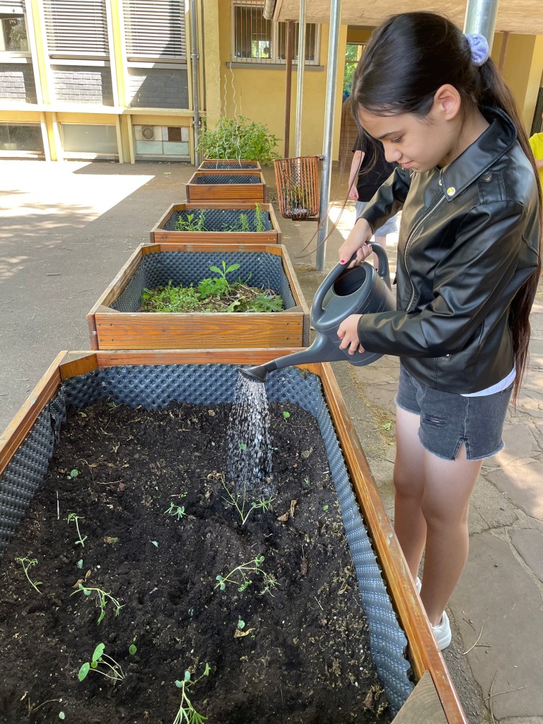 Um den Bienen zu helfen, haben wir Blumensamen in Eierkartons ausgesät und diese anschließend in unsere Hochbeete auf den Schulhof gesetzt. Wir haben gelernt, dass die Wildbienen sich von Pollen und Nektar ernähren. Außerdem pflanzen die Blumen sich so fort, wenn die Wildbiene den Pollen von Blüte zu Blüte trägt.