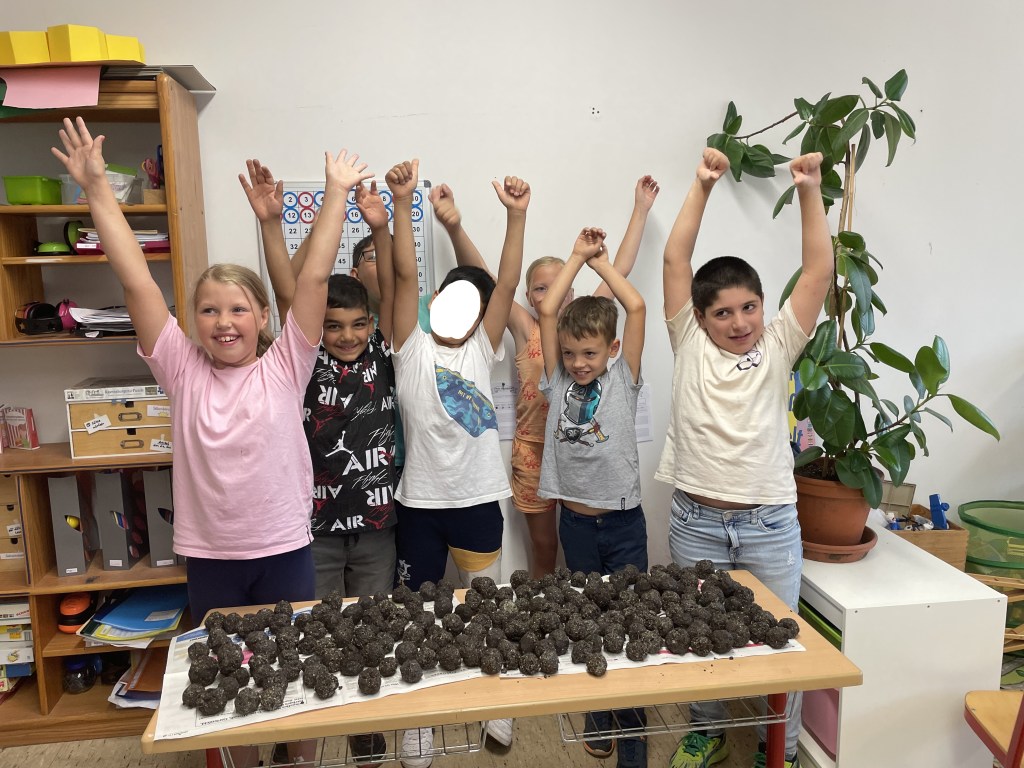 Kurz vor den Sommerferien haben wir 165 Samenbomben gebastelt. Dazu braucht man nur Samen, Blumenerde, Heilerde oder Katzenstreupulver und Wasser. Das Ganze wird zu einem Ball geknetet und muss 2 Tage trocknen. Viele von euch haben eine Samenbombe geschenkt bekommen. Man kann sie auch ganz einfach zu Hause nachbasteln.Was macht ihr damit? Ihr legt sie einfach auf die Erde und nach einiger Zeit sprießen bunte Blumen daraus. Auch dann freuen sich die Wildbienen 😊