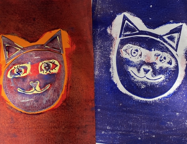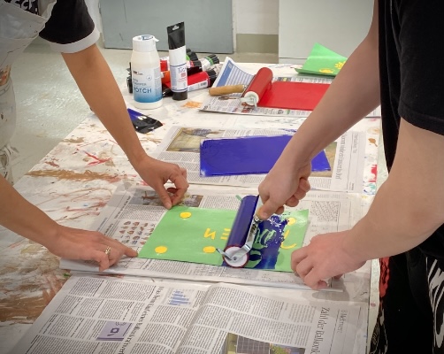 Am 10.10. besuchte unsere Klasse einen Workshop in der Kunstakademie. Wir gingen zu Fuß dorthin. Die Künstlerin Chikako Kato erklärte uns dort alles. Danach suchten wir uns ein Motiv aus und fingen an, eine Druckvorlage aus Pappe zu basteln. Dafür klebten wir alle geschnittenen Einzelteile auf und bestrichen die Pappe dann mit Lack. Nachdem sie getrocknet war, rollten wir mit einer Rolle die Farbe auf die Druckvorlage und drückten dann ein weißes Papier darauf. Alle hatten am Ende ein schönes Ergebnis. (Bericht von Zevalda)