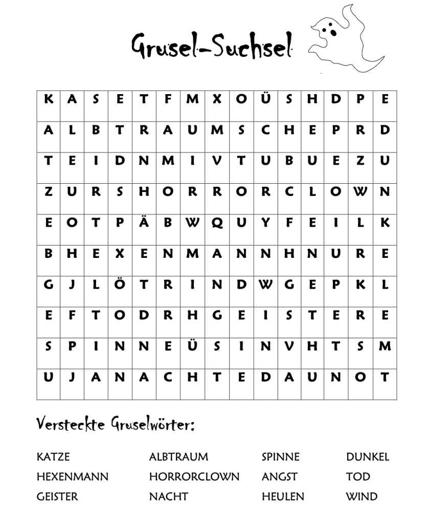 Mohammed und Zoey haben sich ein Grusel-Suchsel ausgedacht. Hier sind 12 Grusel-Wörter im Buchstabensalat versteckt.